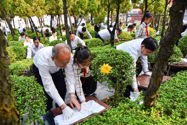 擦拭烈士墓碑,向烈士墓敬献鲜花
