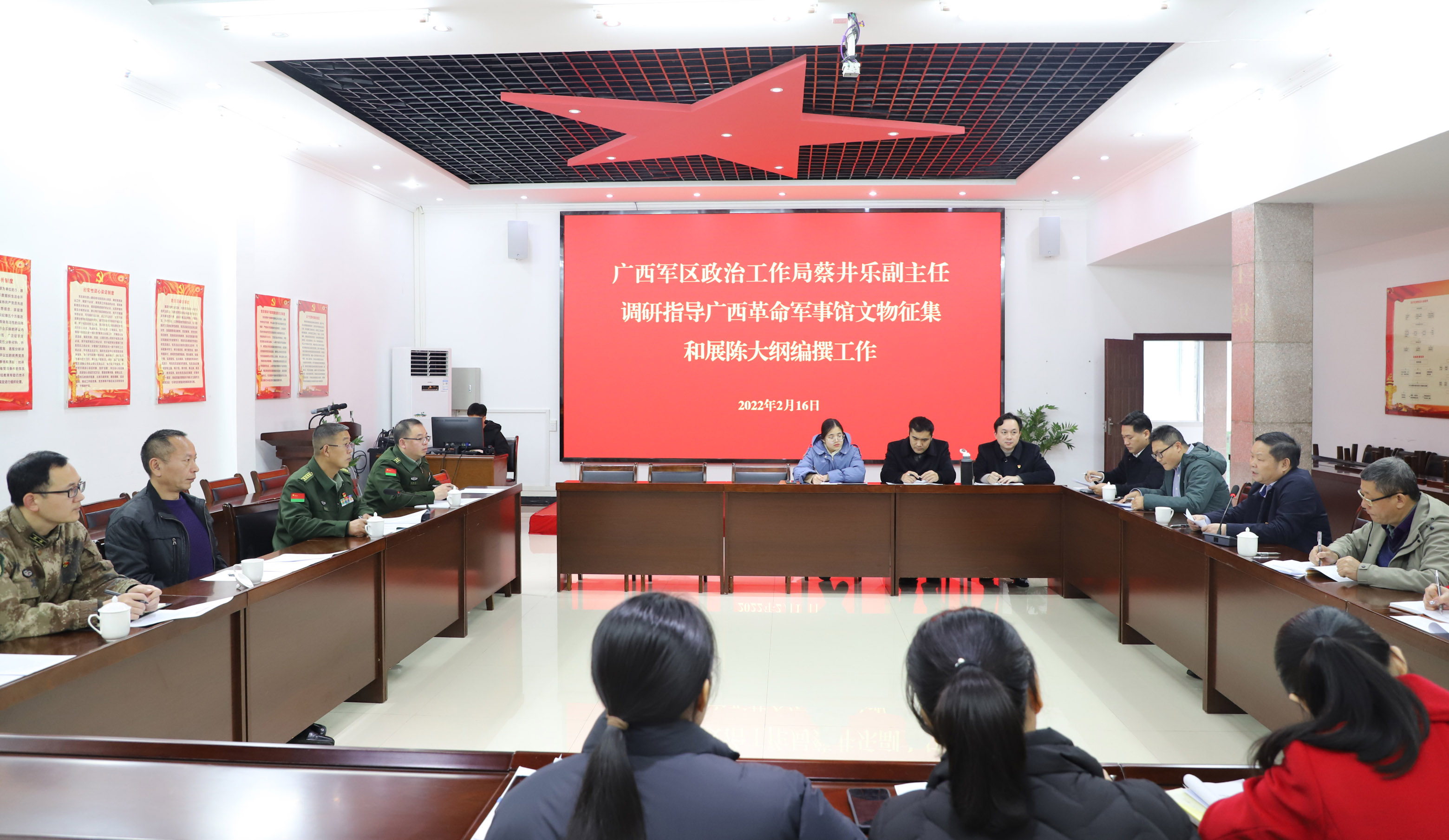 2022年2月16日下午,广西军区政治工作局副主任蔡井乐到广西革命纪念馆调研广西革命军事馆文物征集和展陈大纲编撰工作。广西革命纪念馆馆长、广西革命军事馆文物征集和展陈大纲编撰领导小组副组长、办公室主任(兼)肖志龙等陪同调研。