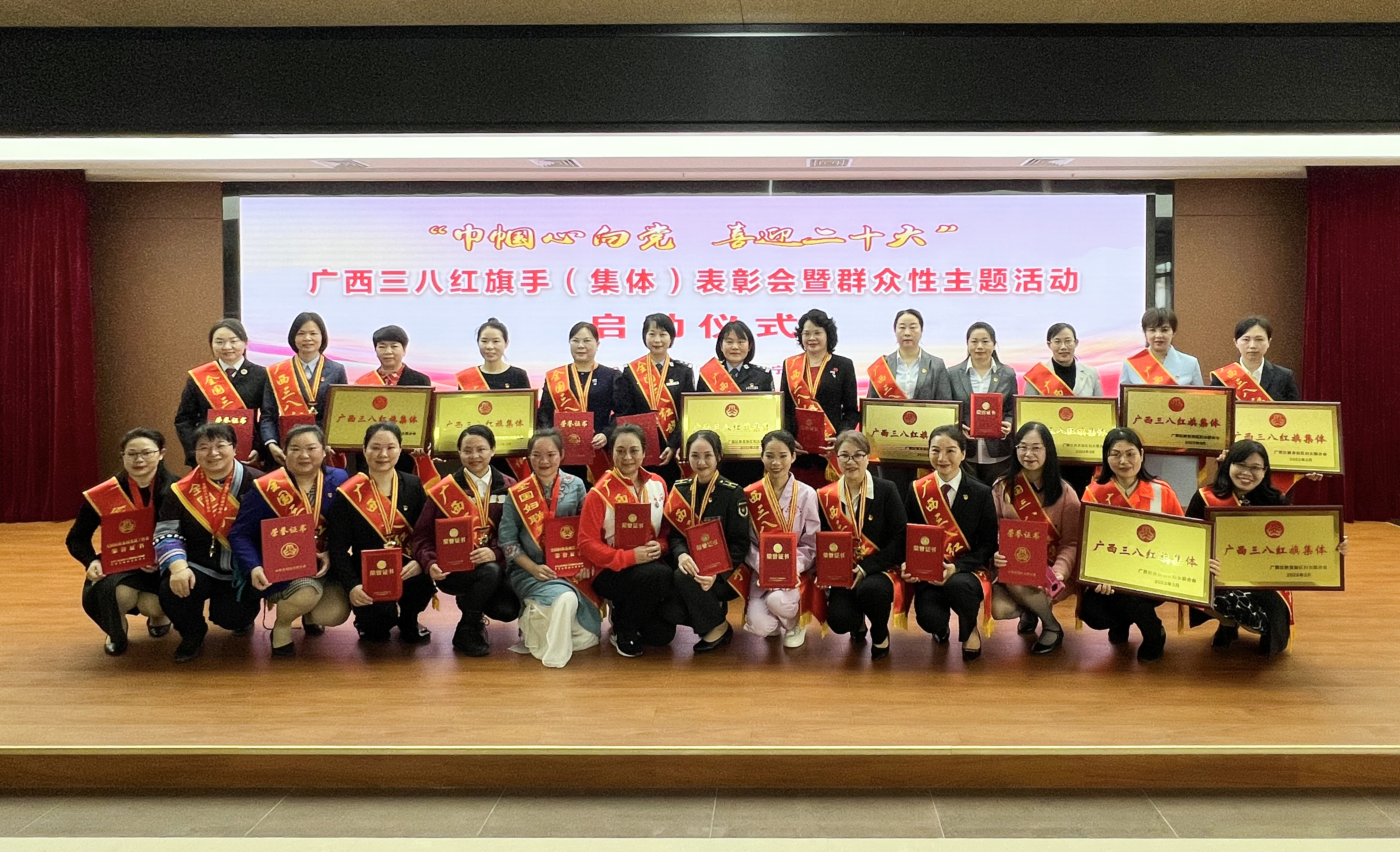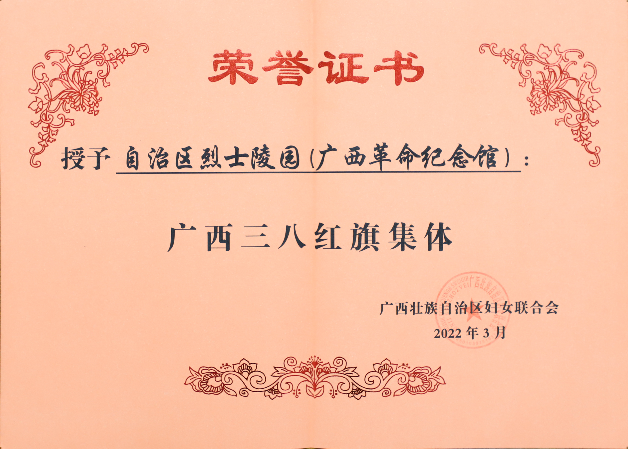 为表彰我区各行各业、各族各界优秀女性在贯彻落实习近平新时代中国特色社会主义思想,服务高质量发展,建设新时代中国特色社会主义壮美广西做出的突出贡献,2022年3月8日,自治区妇联举办“巾帼心向党 喜迎二十大”广西三八红旗手(集体)表彰会,自治区烈士陵园(广西革命纪念馆)荣获广西三八红旗集体奖。