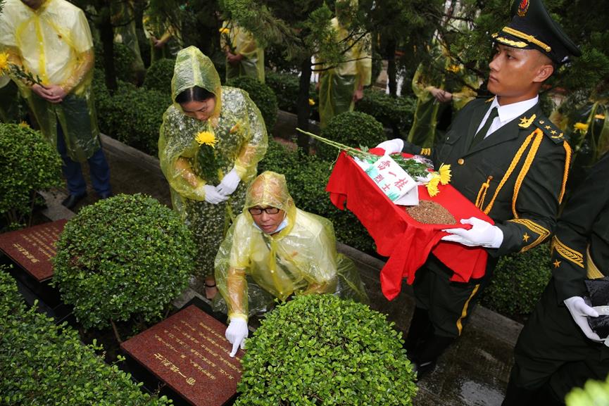 带着故乡的土,陆凤㚢及陆秋㚢在众人的搀扶下,迈着缓缓的步伐走向不远处的英烈苑。雨雾低垂,笼罩苑区,一片肃穆、寂静、悲凉,震撼人心,179座神圣庄严的墓碑整齐伫立,一尘不染。