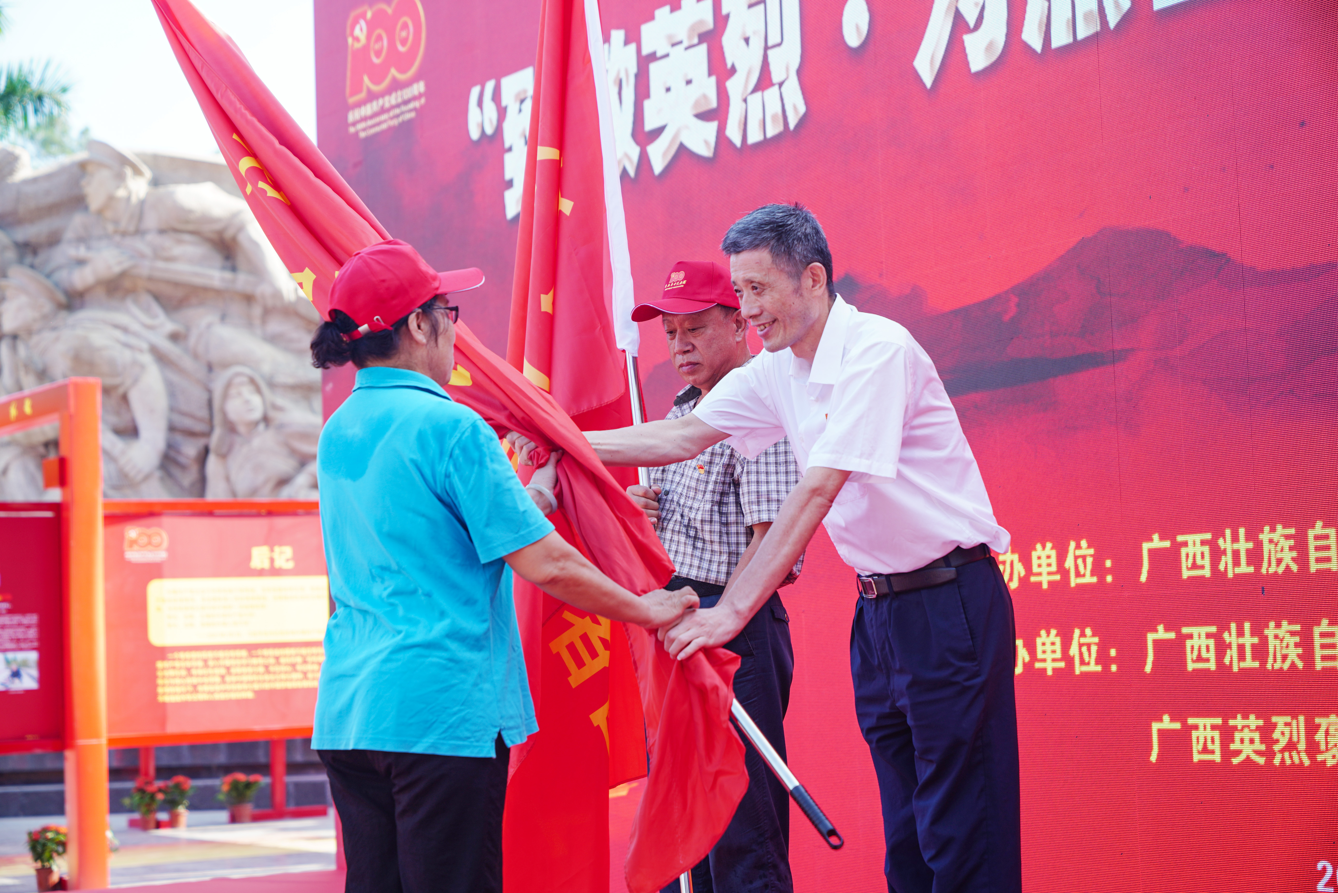 自治区退役军人事务厅党组成员、副厅长李振华向“为烈士寻亲”志愿者团队授旗