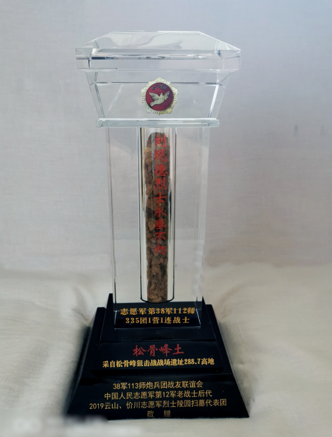 几天后,自治区退役军人事务厅的工作人员在机场接待了这位不远万里来到广西的老兵以及他从朝鲜战场带来的礼物——四个装有松骨峰土的水晶纪念碑。在工作人员接过水晶碑的时候,曹家麟告诉工作人员,这个水晶纪念碑中的土取自朝鲜松骨峰阻击战战场遗址,融入了烈士们的鲜血和生命。